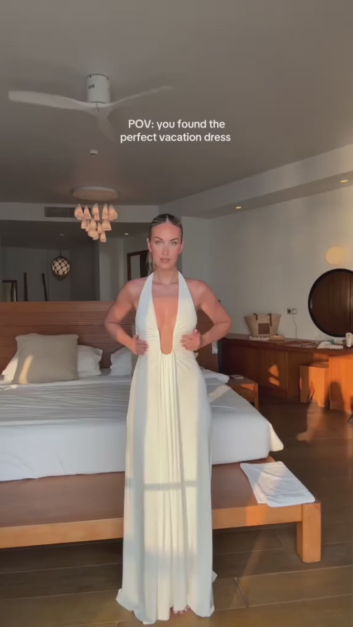Laissez-vous séduire par le charme naturel et fluide de cette robe ivoire. Son tissu en cupro léger épouse les formes avec grâce, tandis que son décolleté profond et ses drapés subtils ajoutent une touche dramatique parfaite du jour au soir.