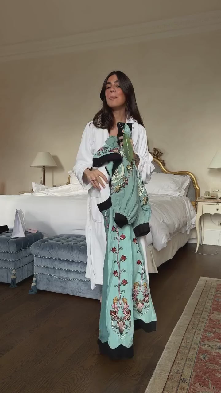 Avec son motif floral délicat orné de cygnes, cette robe incarne à la fois la douceur et le romantisme. Le bord noir contraste élégamment avec la teinte azur pour mettre en valeur chaque détail du design. Son encolure en V flatte le décolleté tandis que sa silhouette fluide et ses manches longues apportent un équilibre parfait entre confort et sophistication. Plus qu’un vêtement, c’est une véritable déclaration de grâce féminine.