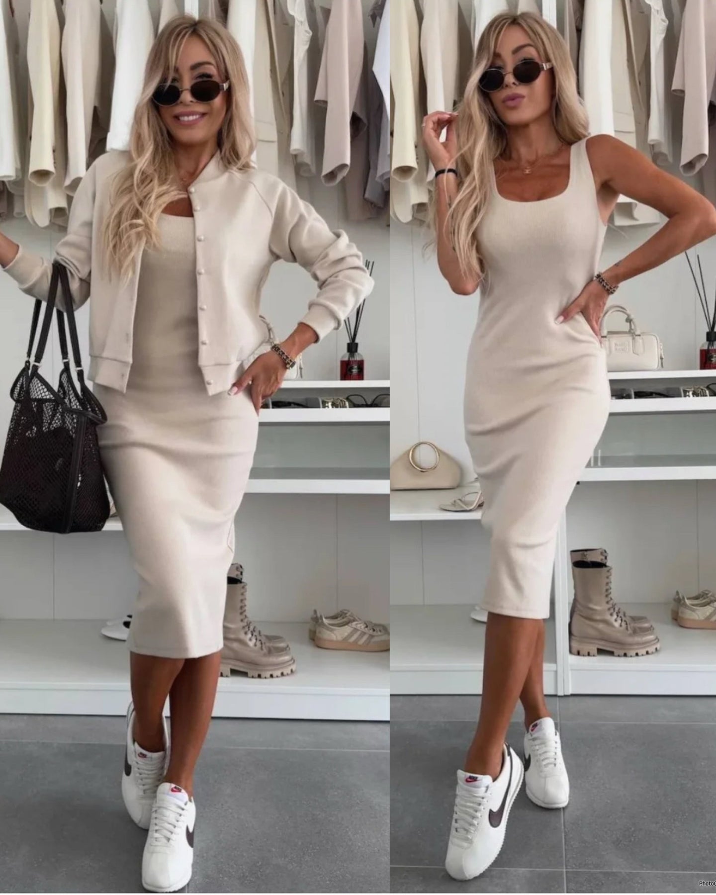Un duo qui allie confort, élégance et attitude. La robe midi épouse délicatement les formes avec une coupe ajustée et extensible, tandis que la veste bomber ajoute une touche urbaine et moderne. Que ce soit au bureau ou en sortie, cet ensemble rehausse instantanément votre style.