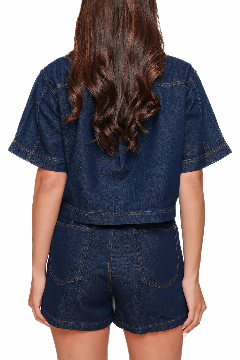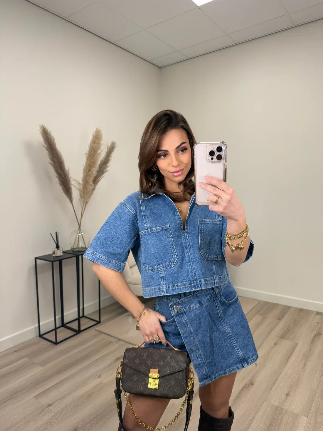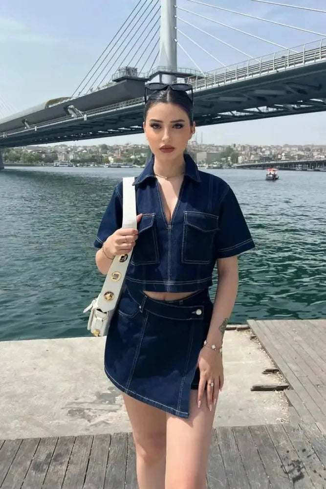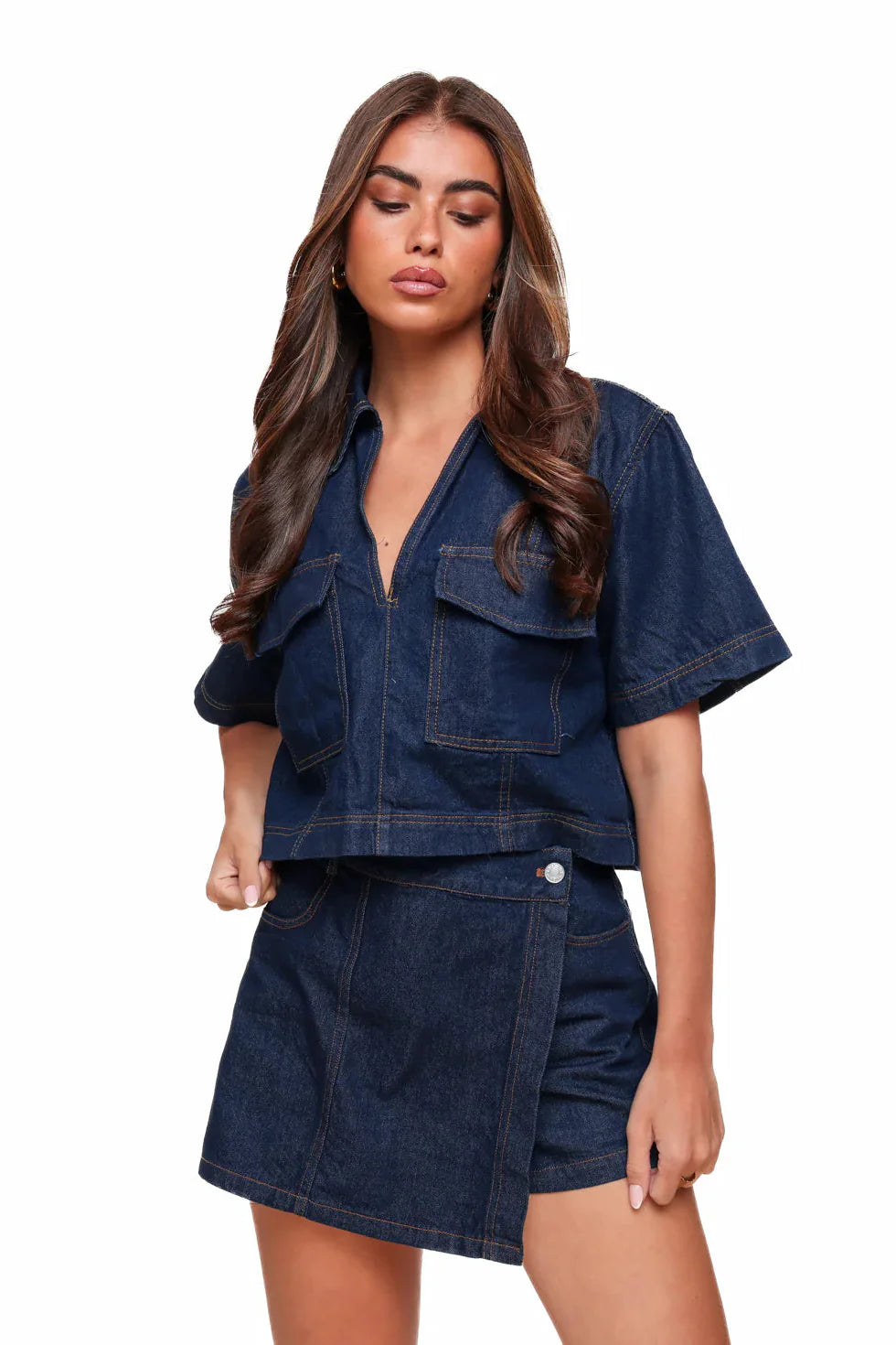 Adoptez une allure audacieuse et actuelle avec cet ensemble deux pièces en denim brut. La chemise courte à manches larges et poches oversize se marie parfaitement avec la jupe portefeuille à bouton-pression, créant un look à la fois utilitaire et féminin. Parfait pour une sortie en ville ou un brunch entre amies, ce look en denim foncé s’impose comme un essentiel de saison.