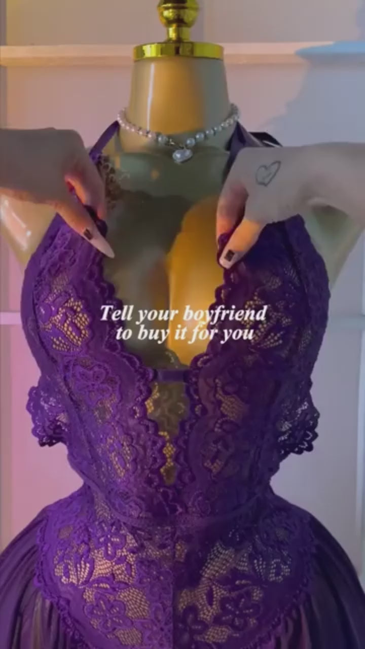 • Décolleté en V profond, dos ouvert et bande de dentelle sous la poitrine pour mettre subtilement en valeur la silhouette.